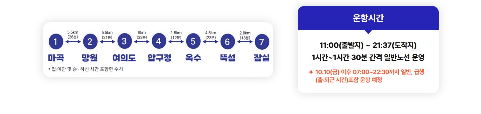 | 완행 | 마곡~잠실(전체 정류장) | 약 75~90분 | 평일 06:30~22:30, 주말 09:30~22:30 | 야경 추천 |